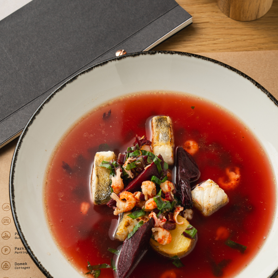 | Wildschwein-Eintopf mit Sechlońska-Pflaume, hausgemachtem Knödel, Rote-Bete-Grün und Dill | 75 pln |