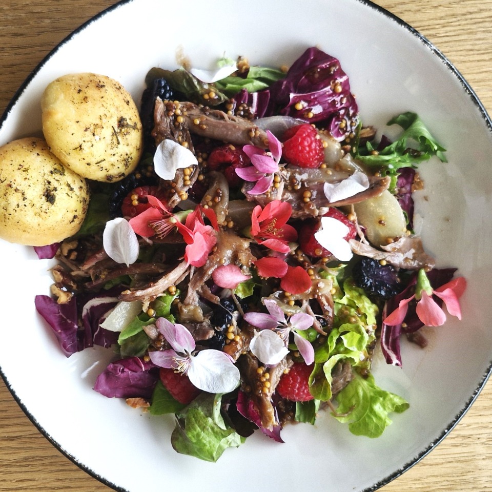 Salat mit confiertem Entenkeule mit Birnen in Sirup pochiert, Brombeeren, Himbeeren, Dressing und einem Rosmarinbrötchen | 55 pln |