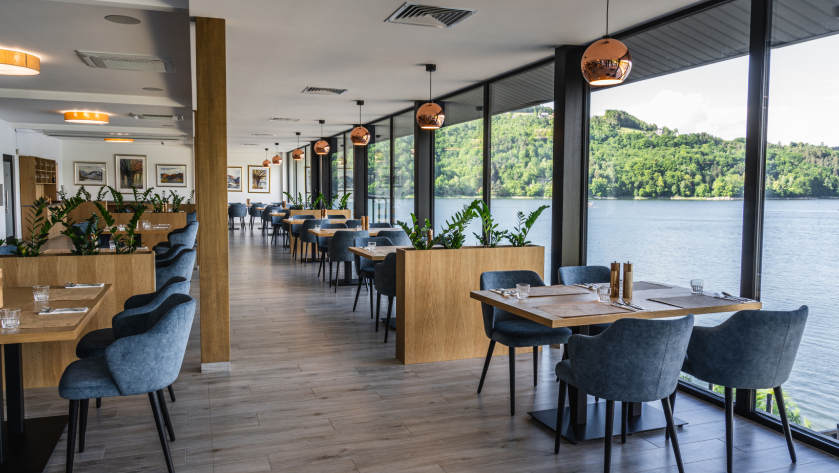 Wnętrza naszej restauracji to przestrzeń, przytulność i niczym nieograniczony widok na Jezioro Rożnowskie. Przeszklone ściany sprawiają, że każda pora dnia to inny spektakl przygotowany przez naturę, który możemy podziwiać podczas posiłków.